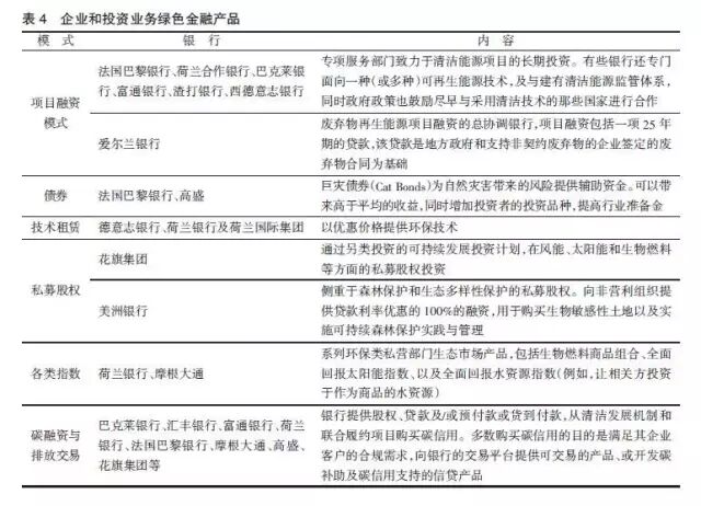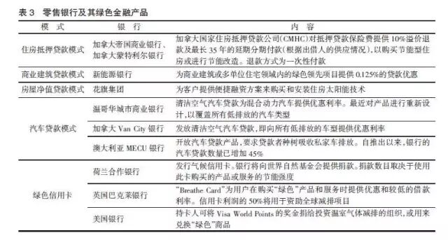 1. 零售类绿色金融产品。零售领域的产品和服务包括贷款和抵押、借记卡和信用卡服务、旅行支票、汇票、透支保护、现金管理服务及保险等。储蓄机构也在从事零售银行,如互助储蓄和贷款银行及信用社。国外银行已在绿色金融业务上取得了一些突破性进展,创新了不少绿色金融业务产品和模式(见表3)。