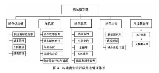 6. 企业文化。首先,应积极倡导绿色环保理念,树立可持续发展观,将打造“绿色银行”的卓越品牌植入银行的企业文化体系。在制定发展战略和进行决策、管理时渗透绿色意识,以生态与经济协同发展作为自身追求的发展目标。还需要对员工加强绿色宣传和教育,让绿色价值观成为广大员工共同的价值观。将开展绿色融资、塑造绿色企业形象、创造绿色品牌作为自身的绿色愿景,以建立持久的竞争优势。其次,建立健全绿色规章制度,将绿色价值观念融入企业的各种规章制度中,形成一套系统的绿色管理制度和方法,并不断完善制度监督执行机制。应探索执行ISO14000国际环境管理系列标准,探索推进ISO14000环境管理标准认证。实施绿色会计与绿色审计制度。其三,加强绿色办公运营,完善自身环境足迹管理工作。可学习国际先进银行设立银行总体减排目标,减少自身日常经营中温室气体排放及能源消耗,减少银行自身可能对环境产生的负面影响,具体措施有构建绿色供应链、提高能源使用效率、使用可再生能源或清洁能源、发展绿色节能建筑、鼓励绿色出行以及收集监测自身排放数据等。进一步明确全行环境足迹管理的牵头管理部门,进一步推进全行绿色办公、绿色运营(见图4)。