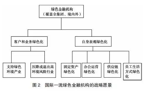 1. 战略愿景。为更好地适应国际可持续发展及国内经济转型趋势,商业银行应长期、全面、深入地贯彻绿色金融战略,在全集团、境内外全面强化绿色金融布局,持续加强自身节能减排,以打造国际一流的绿色金融机构。所谓国际一流的绿色金融机构,一方面是指客户和业务的绿色化,即通过绿色融资加大对绿色环保产业的支持,同时压降或退出高环境风险行业和客户,从而促进经济绿色发展;另一方面是指自身表现的绿色化,即通过引入内部环境管理手段及先进技术积极管理自身的环境足迹,减少自身日常经营中温室气体排放及能源消耗(见图2)。