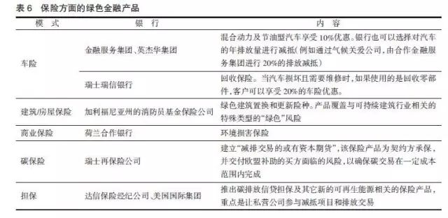 4. 保险类绿色金融产品。保险领域通常分为两大类:人寿保险和一般(非人寿)保险。“绿色”保险属于后者,通常包含两个产品领域:一是根据环保相关特性,允许保险费差异化;二是专门针对清洁技术和减排活动而裁剪的保险产品(见表6)。