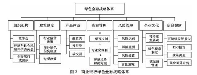 为适应监管及可持续发展对金融的要求,在借鉴国际先进银行相关经验的基础上,商业银行应从组织架构、政策制度、产品体系、流程管理、风险管理、企业文化、信息披露等七大方面入手,构建绿色金融战略体系,全方位打造绿色金融机构(见图3)。