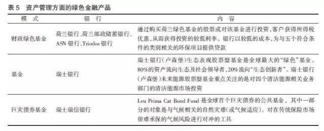 3. 资产管理类绿色金融产品。资产管理已经成为金融行业发展最快的部门,也是当前银行的一个核心业务部门。该领域重点是为客户提供关于资产规划、共有基金、资产管理计划、税项、信托服务、国际融资规划、全球私人银行及全面性投资经纪服务和优惠投资经纪服务。资产管理经理可能是顾问或代表投资者进行专户管理方面的专家,其服务通常需要进行严格的财务分析,外加资产和股票选股、计划实施以及对投资活动的定期监督和报告。资产管理方面的绿色金融产品以基金为主(见表5)。