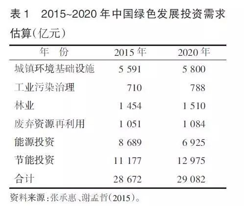 首先,生态建设资金缺口巨大,亟须通过市场化途径解决融资问题。根据世界经济论坛(2013)的估计,截至2030年,单是向能源、交通、建筑等绿色基础设施的转型,每年就需增加相当于全球GDP 1.5%左右的额外投资。根据新气候经济全球委员会的预测,未来在节能和清洁能源上需要每年净增投资4万亿美元。根据国内有关估算,从2015~2020年,中国绿色发展的相应投资需求大约为每年2.9万亿元,其中新增的绿色金融需求大体上在每年2万亿元(见表1)。