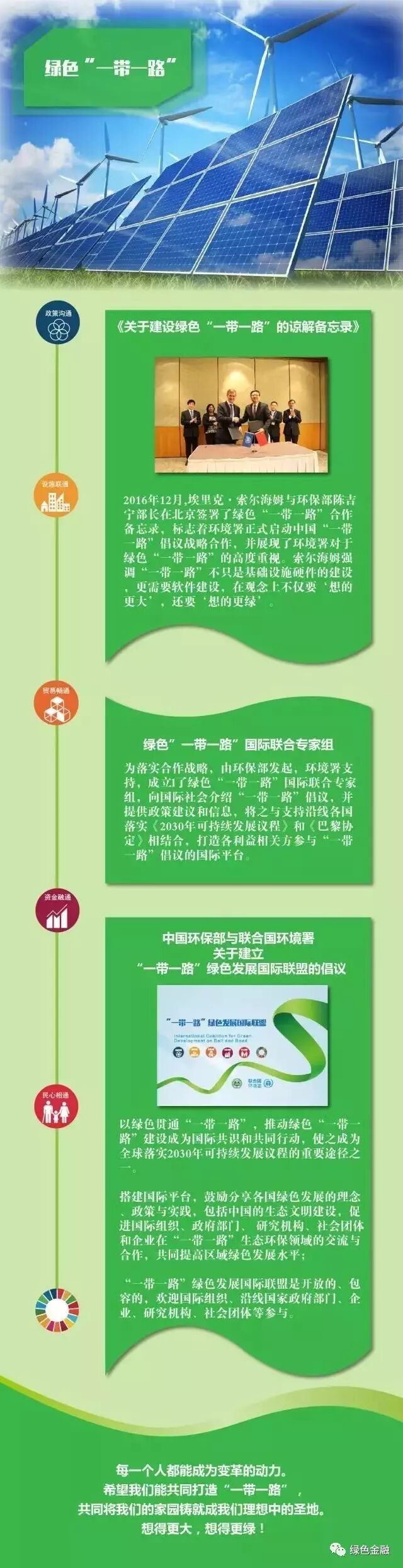 中国在去年G20峰会期间将“绿色金融”这一理念推到聚光灯下,在正确方向的指引下,我们需加大努力绿化银行业,保险业,证券交易所等,将国际金融领域的巨头,如亚洲开发银行,亚投行都划入“一带一路”发展蓝图。